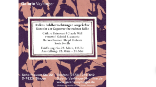 In Fortführung unserer Reihe BILD und WORT laden wir herzlich ein am Sonntag 22. März zur Eröffnung eines ungewöhnlichen Projektes... siehe beigefügter Galeriebrief. Alle Beteiligten freuen sich über Ihren Besuch, mit herzlichen Grüßen Ihre Galerie Vayhinger - Helena Vayhinger